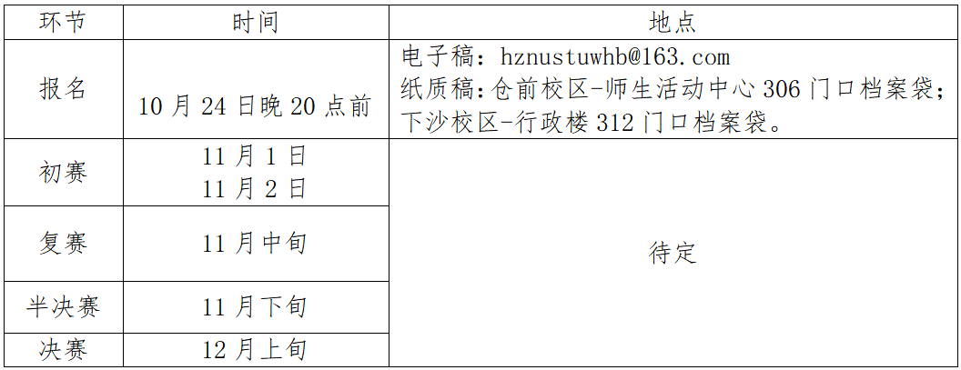 请各参赛队伍认真填写报名表(附件1),并于10月24日(周五)20:00前将电子表(以“树人杯辩论赛+学院全称”命名)发送至校学生会学术文化部邮箱:hznustuwhb@163.com。报名表纸质稿于10月24日(周五)20:00前,仓前校区交至师生活动中心306门口档案袋,下沙校区交至行政楼312门口档案袋。