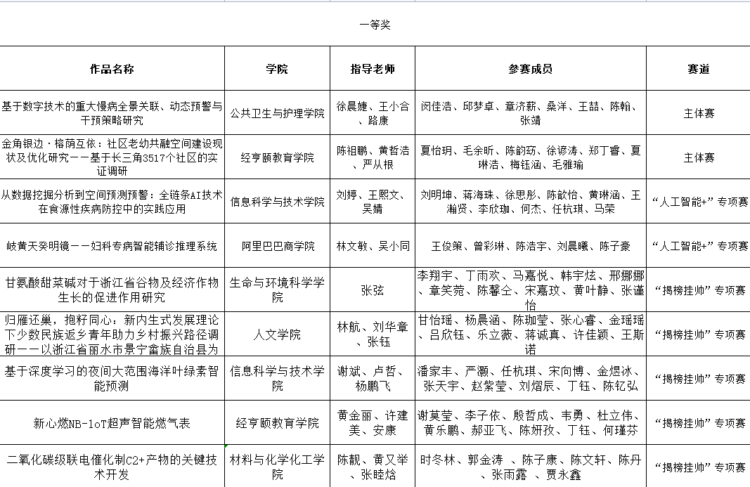 一等奖 | 基于数字技术的重大慢病全景关联、动态预警与干预策略研究 | 公共卫生与护理学院 | 徐晨婕、王小合、路康 | 闵佳浩、邱梦卓、章济薪、桑洋、王喆、陈翰、张靖 |